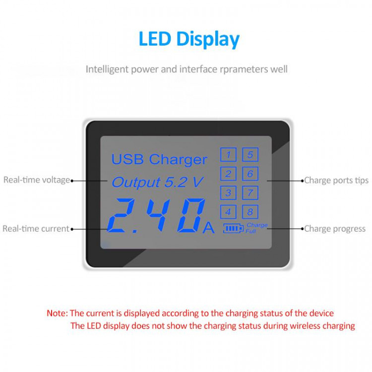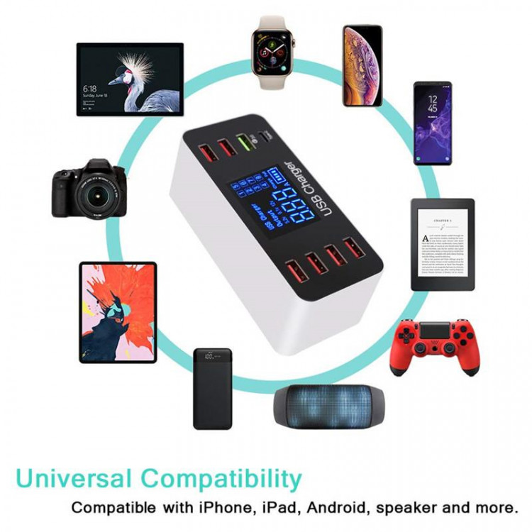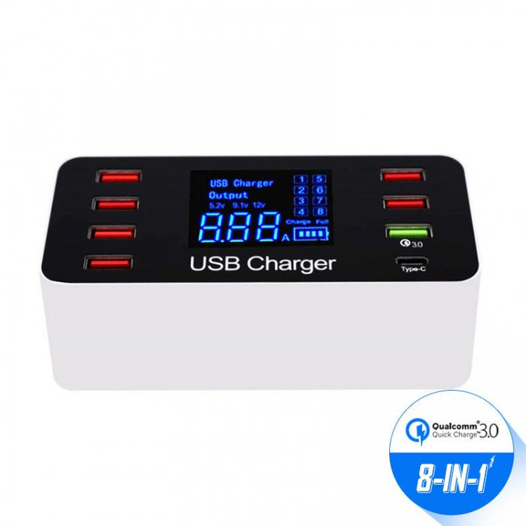 With one quick charge 3.0 fast charge port and type-c charging port, compatible with quick charge 3.0 enabled and type-c devices. The unique LED display can help you monitor the charging current, voltage and battery status at real time. 8 USB Ports are named from 1 to 8, if you use the port 1, the screen will light up with flashing number 1, and others will be dark if you are not using them. 100-240V universal input voltage range. Ideal for home, office, travel, hotel and conference room.