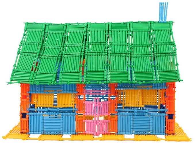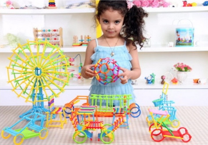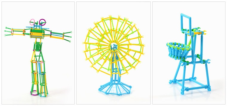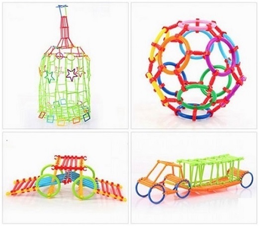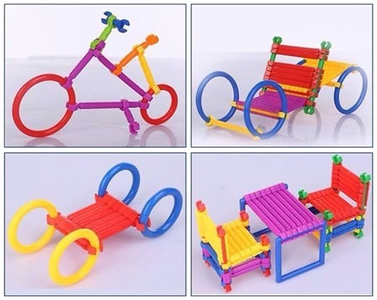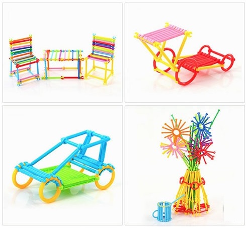 Thiết kế thông minh, sáng tạo Với những que nhựa có hình dạng (tròn, dài, vuông, sao) và màu sắc (xanh, đỏ, vàng, hồng...) khác nhau, các bé có thể thoải mái sáng tạo ra những mô hình mới lạ, độc đáo tùy thuộc vào trí tưởng tượng phong phú của mình.