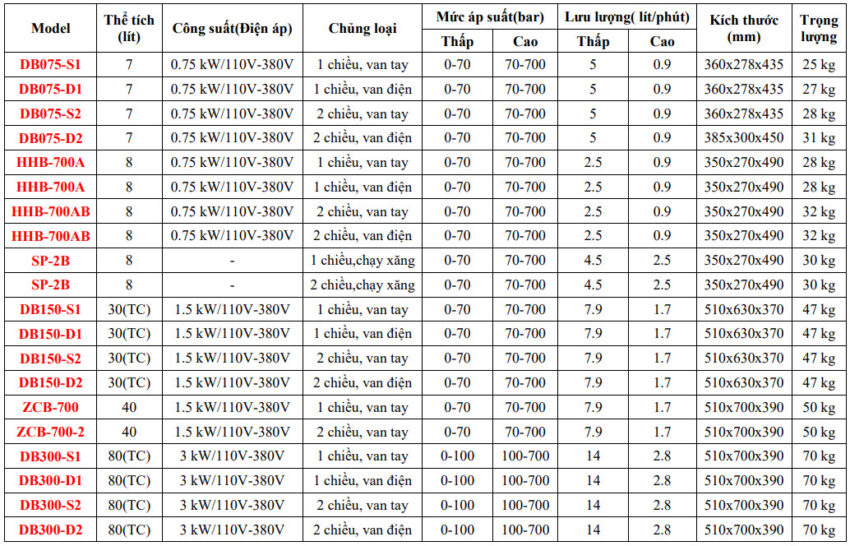 + Thông tin chi tiết về Bơm điện thủy lực ZCB-700-2 – Đây là bơm điện thủy lực dùng cho thiết bị thủy lực 2 chiều – Model: ZCB-700-2 – Dung tích bình chứa dầu: 40 lít – Đầu nối ra dây: PT 3/8” – áp suất làm việc max.700 bar. – Trọng lượng: 50 kg + Bơm cho kích thủy lực có thể chạy bằng sức lao động con người( bằng tay), chạy bằng khí nén, chạy bằng điện, chạy bằng xăng để tao ra áp suất cung cấp dầu cho kích thủy lực hoạt động. + Bơm điện thủy lực dùng cho kích thủy lực dùng để nâng hạ thiết bị với trọng tải lớn vượt quá sức lao động của con người và các vị trí khó mà con người không thực hiện được. + Có 2 loại bơm điện chính đó là Bơm điện kích 1 chiều và Bơm điện kích thủy lực 2 chiều. – Bơm điện kích kích 1 chiều: dùng cho kích thủy lực 1 chiều tạo ra áp suất 0-3.000 bar tùy thuộc vào nhu cầu sử dụng và có dung tích bình chứa lên tới 500 lít. – Bơm điện kích kích 2 chiều: dùng cho kích thủy lực 2 chiều tạo ra áp suất 0-3.000 bar tùy thuộc vào nhu cầu sử dụng và có dung tích bình chứa lên tới 500 lít. + Chất lượng gioong phớt tốt tạo độ kín khít cho xy lanh vì vậy có thể tạo ra áp suất từ 0-3.000 bar tùy thuộc vào nhu cầu của con người. + Thông thường ở Việt Nam thường dùng bơm thủy lực tao ra áp suất 700 bar tuy nhiên tùy thuộc vào yêu cầu của thiết bị có thể lên tới 3.000 bar. + Một hệ thống kích thủy lực hoàn chỉnh có thể bao gồm( Bơm thủy lực+ kích thủy lực+ Dây và phụ kiện) tuy nhiên cũng có thể dùng 1 bơm thủy lực kết nối với 1,2,3,4,..100 kích thủy lực tùy thuộc vào nhu cầu của công trường thi công. + Bơm điện thủy lực sau khi sử dụng xong chúng tao phải vệ sinh sạch sẽ bảo quản nơi khô thoáng để đảm bảo độ bền và độ chính xác của thiết bị. + Bơm điện thủy lực dễ sử dụng, tạo hiệu suất cao trong công việc rất phù hợp với điều kiện thi công tại Việt Nam. + Với tay điều khiển tạo sự an toàn cho người sử dụng. * Juda/China Được thành lập cùng với sự phát triển của nền công nghiệp hiện đại với công nghệ và dây truyền tiến tiến chuyên lắp ráp và cung cấp các dòng sản phẩm Kích thủy lực, Kích thủy lực con đội, Kích móc thủy lực, Đột thủy lực, Máy ép đầu cos… với các mẫu sản phẩm chất lượng, phù hợp với nhu cầu thực tế của con người mà hiện nay đã có mặt trên toàn thế giới. * Hình ảnh thực tế: