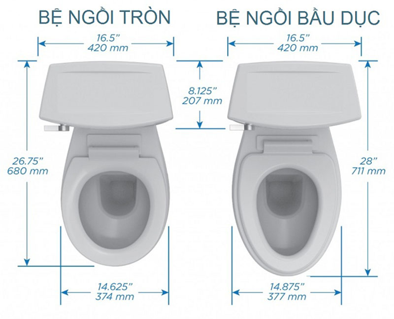 Có hai kiểu bệ ngồi phổ biến nhất hiện nay là bệ ngồi hình bầu dục hoặc hình tròn. Trong đó, bệ ngồi bồn cầu bầu dục mang lại cảm giác thoải mái khi ngồi vì có diện tích bề mặt lớn hơn. Tuy nhiên, thiết kế này thường yêu cầu không gian nhà tắm rộng hơn so với bệ ngồi tròn. Vì vậy, đối với phòng tắm hẹp, bệ ngồi hình tròn sẽ là sự lựa chọn phù hợp.