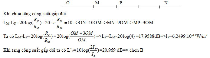 Nhận biếtBốn điểm O, M,P, N theo thứ tự là các điểm thẳng hàng trong không khí và NP = 2MP. Khi đặt một nguồn âm (là nguồn điểm) tại O thì mức cường độ âm tại M và N lần lượt là LM = 30 dB và LN = 10 dB. Cho rằng môi trường truyền âm đẳng hướng và không hấp thụ âm. Nếu tăng công suất nguồn âm lên gấp đôi thì mức cường độ âm tại P xấp xỉ bằng