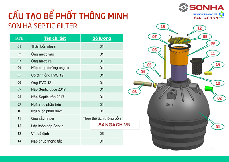 Cấu tạo và nguyên lý hoạt động của bể phốt thông minh Sơn Hà Septic Filter 2500L