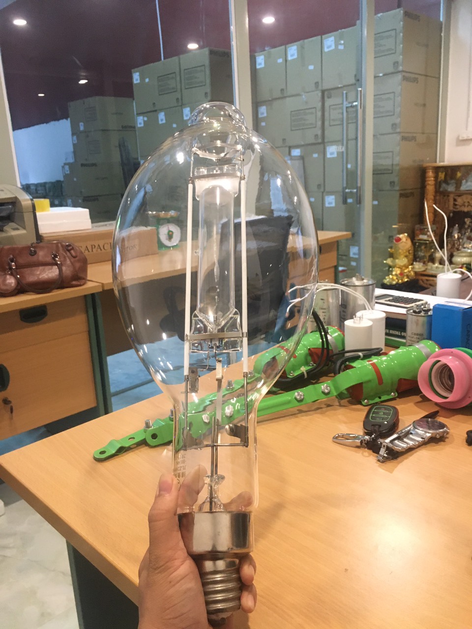 – Công suất : 2000W – Chuẩn đuôi : E39 – Kích thước : Ø202 x 505 mm – Ghép bộ : CWA 2000W (Constant Wattage Autotransformer), tụ CWACAP56. – Cường độ ánh sáng : 230.000 lm – Nhiệt độ màu : vàng nắng (4200K)