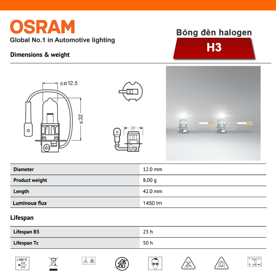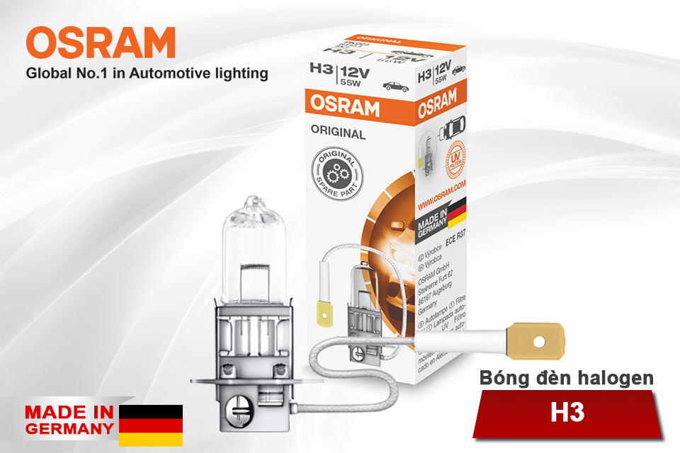 - Bóng đèn halogen OSRAM ORIGINAL H3 12v 55w được chế tạo bằng thủy tinh cao cấp đạt tuổi thọ sử dụng cao giúp hỗ trợ chiếu sáng hiệu quả trên những chặng đường dài