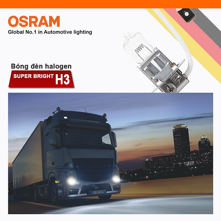 - Bóng đèn halogen OSRAM SUPER BRIGHT H3 24v 100w được chế tạo bằng thủy tinh cao cấp đạt tuổi thọ sử dụng phù hợp giúp hỗ trợ chiếu sáng hiệu quả trên những chặng đường dài