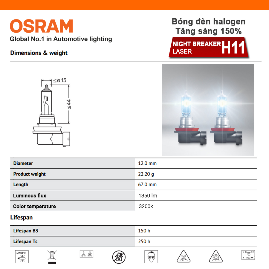 Hướng dẫn sử dụng và bảo quản Bóng đèn halogen tăng sáng 150% OSRAM NIGHT BREAKER LASER H11 12v 55w