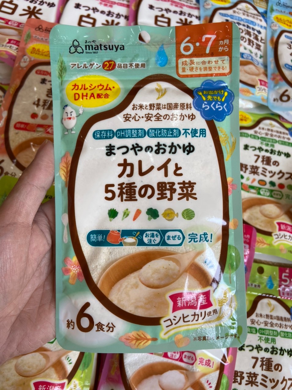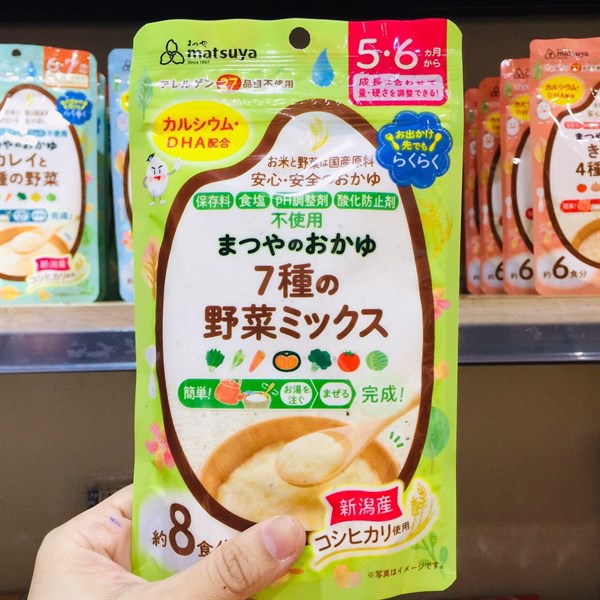 Có 5 loại vị:1. Nâu: Bột Cháo Matsuya Nhật Vị Cá, nấm rau củ (6m+)(42g), ăn được 6 lần2. Xanh dương: Bột Cháo Matsuya Nhật Vị rong biển rau củ (7m+)(42g), ăn được khoảng 6 lần3. Xanh đậm: Bột Cháo Matsuya Nhật Vị cá bơn rau củ (6m+)(42g), ăn được khoảng 6 lần4. Hồng: Bột Cháo Matsuya Vị gạo trắng DHA (5m+)(70g), ăn được khoảng 10 lần5. Xanh lá: Bột Cháo Matsuya Vị mix 7 loại rau củ (5m+)(56g), ăn được khoảng 8 lần