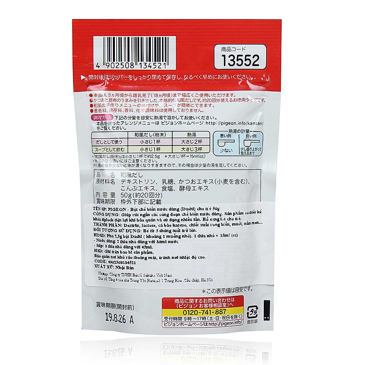 Bột chế biến nước dùng Dashi Pigeon 50g là một trong những sản phẩm dashi nổi tiếng đến từ nước Nhật cung cấp đủ chất dinh dưỡng cho bé trong một bữa ăn dặm mà các mẹ không phải tốn nhiều thời gian và công sức chế biến. Bột được bà mẹ Nhật tin dùng, là sự lựa chọn hoàn hảo thay thế cho nước ninh xương vốn không hề tốt cho sức khỏe của bé như mọi người vẫn nghĩ (quá nhiều chất béo và chứa canxi vô cơ hòa tan từ tủy xương, rất khó tiêu hóa)
