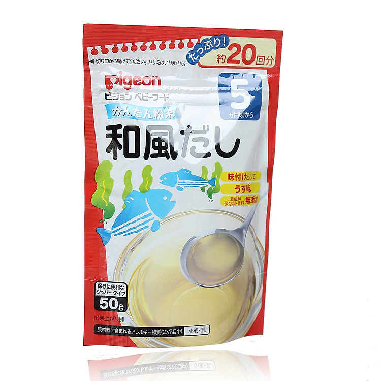 Bột chế biến nước dùng Dashi Pigeon 50g chứa rong biển, cá ngừ hoàn toàn không sử dụng chất bảo quản, không sử dụng gia vị hóa học, đảm bảo an toàn tuyệt đối cho sức khỏe của bé