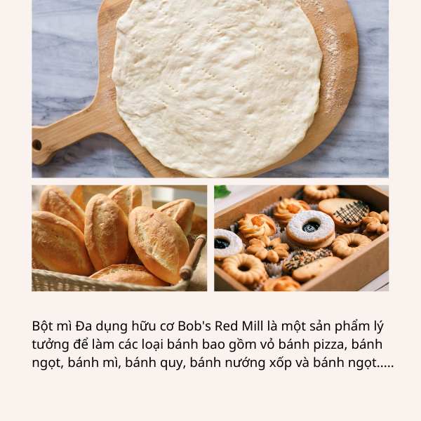 Bột mì đa dụng hữu cơ của Bob's Red Mill là loại bột làm bánh cao cấp xay từ lúa mì cứng đỏ hữu cơ đã được Bộ Nông nghiệp Hoa Kỳ (USDA) chứng nhận. Bạn có thể sử dụng sản phẩm bột mì chất lượng cao này cho tất cả các loại bánh nướng, bao gồm bánh mì men, bánh mì thường, bánh quy, bánh nướng xốp và bánh ngọt. Sản phẩm hoàn toàn không bị tẩy trắng, không chứa kali bromat.