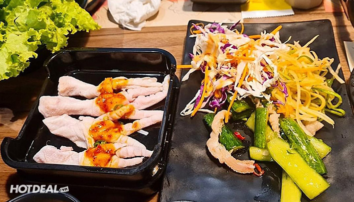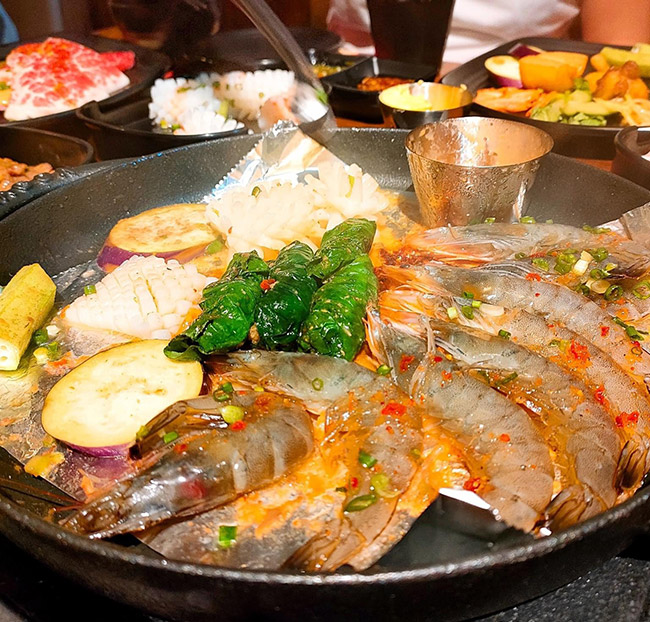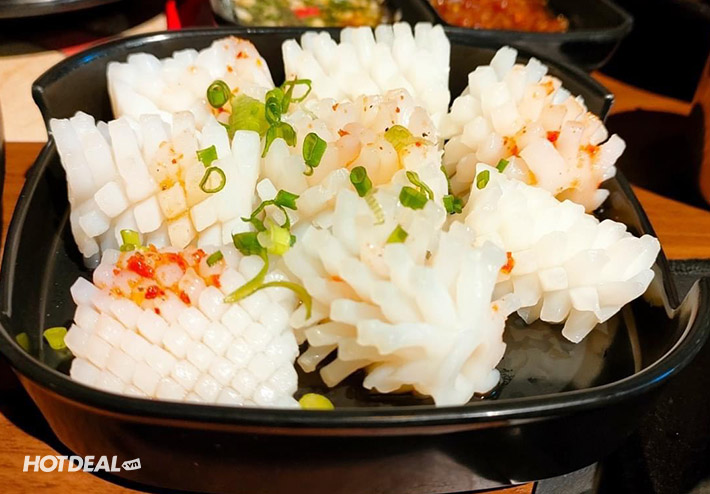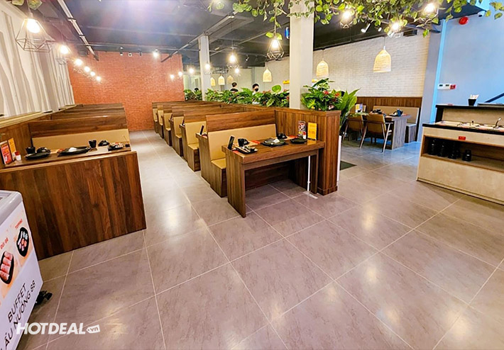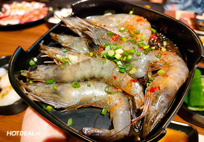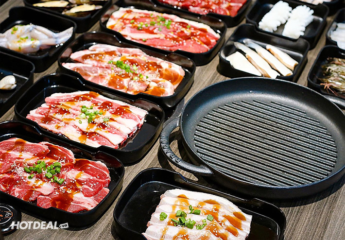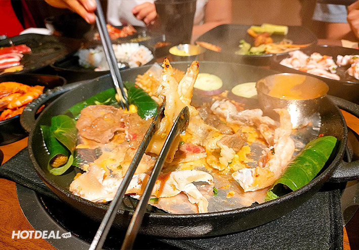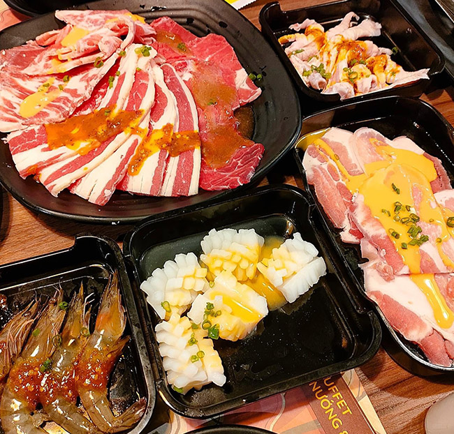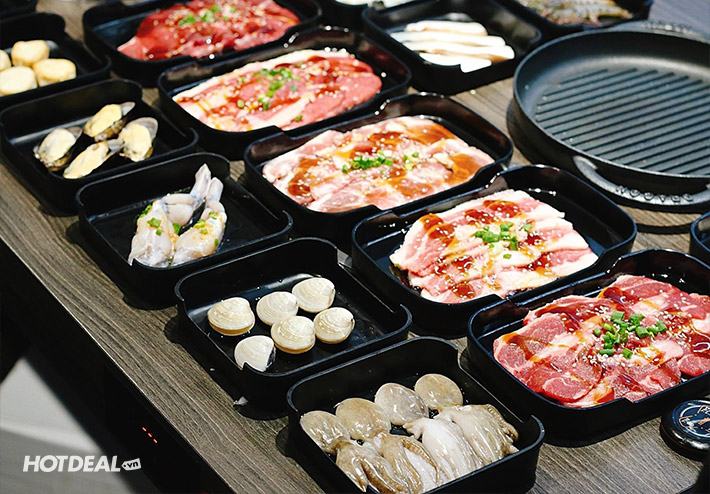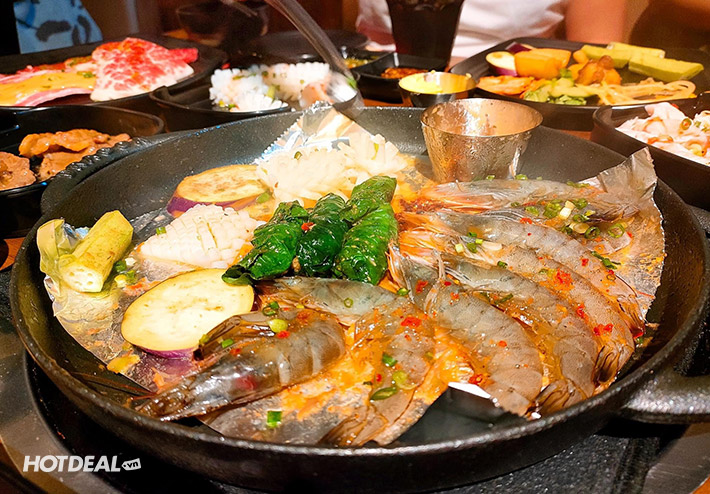 - Thực đơn món nướng đa dạng, vị ngon hảo hảng được chế biến từ hải sản và thịt tươi như: tôm, mực, cá hồi, nghêu, vẹm, thịt cá sấu; thịt bò Úc, bò Mỹ cao cấp, nạc dăm heo, thịt gà... - Ngoài ra, còn có các món ăn làm sẵn tại quầy line tự chọn thơm ngon, bắt mắt. - Không gian rộng rãi, thoáng mát và gần gũi, rất phù hợp với các bữa tiệc thân mật cùng bạn bè, gia đình.