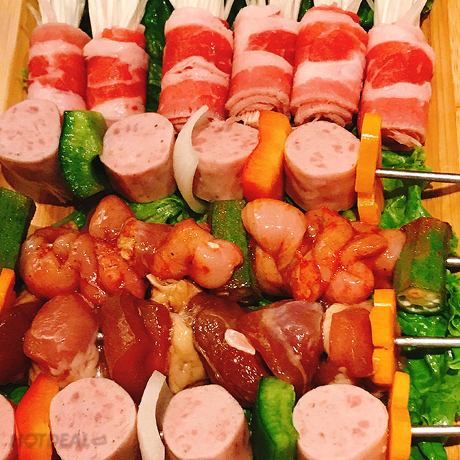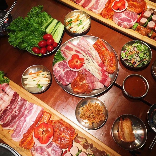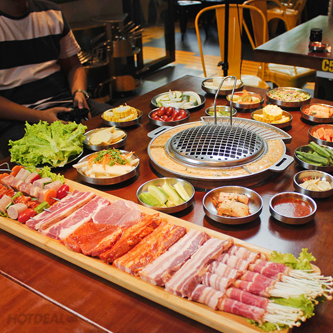 Với hình thức Buffet ăn không giới hạn, bạn sẽ thỏa thích thưởng thức những món thịt: Ba chỉ heo, Nạc vai heo, Ba chỉ heo cuộn kim chi cải thảo, Ba chỉ bò cuộn nấm kim châm, Ba chỉ sốt xì dầu buk buk... được tẩm ướp theo công thức riêng biệt, đậm đà gia vị kiểu Hàn. Đi kèm có 3 loại sốt chính: sốt cay hàn quốc, sốt omecha, sốt thịt.