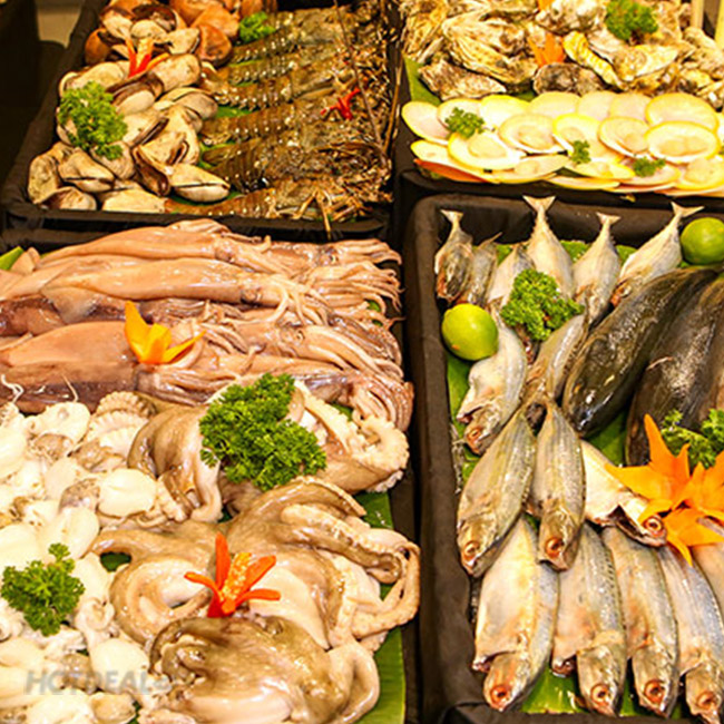 Quầy hải sản đa dạng với các loại hải sải tươi sống đến từ các vùng biển khác nhau của Việt Nam như tôm hùm, tôm sú, vẹm xanh, mực, bạch tuộc, cá… Hải sản được chế biến theo phong cách riêng của nhà hàng, hương vị mới mẻ, thơm ngon khó cưỡng.