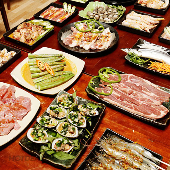 - Thực đơn buffet với gần 60 món, được chế biến từ các nguyên liệu hảo hạng, tươi ngon như bò Mỹ, bò Úc, bạch tuộc, ốc len, nghêu, ốc bươu, tôm, sò huyết, sò lông, sườn cừu, thú linh, gân heo, bắp heo, cánh gà, chân gà, ức vịt, thịt dê, vú dê…