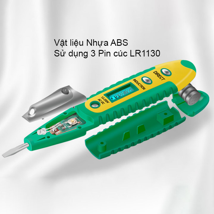 Sản phẩm sử dụng 3 pin cúc AG10 (LR1130/L1131) gắn bên trong (có thể tháo để thay pin). Bút thử được điện áp DC-AC từ 12-220V hay kiểm tra nhanh dây dẫn hay ổ điện có điện hay không mà không cần chạm vào lỗi dây (Kiểm tra dây điện bị đứt) hay bên trong ổ cắm (chỉ cần để gần vỏ dây hay ổ điện)