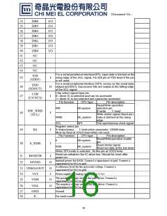 Document No.: 34 35 36 37 38 39 40 41 42 43 44 DB6 DB5 DB4 DB3 DB2 DB1 DB0 NC I/O I/O I/O I/O I/O I/O I/O NC NC NC For a serial peripheral interface(SPI), input data is fetched at the rising edge of the SCL signal, Fix SDI pin at VSS level if the pin is not used. For a serial peripheral interface (SPI), serves as the serial data olutput pin(SDO), Successive bits are output at the falling edge of the SCL signal. Chip select signal input pin. 0= driver IC is selected and can be accessed. 1= driver IC is not selected and cannot be accessed. SDI (SDIN) 45 46 47 I O I SDO (SDOUT) CSB (CS/NCS) Pin function CPU type Pin description Read/Write operation selection pin RW 68-system RW_WRB (SCL) 0=write 1=read 48 I Write strobe signal.(Input pin) Data is fetched at the rising edge. WRB SCL 80_system SPI The synchronous clock signal Register select pin. 49 50 0=Index/status, 1=instructionparameter, GRAM data Must be fixed at VDD3 level when not used. RS I I Pin Function CPU type Pin description Read/Writeoperation enable pin E 68-system E_RDB Read strobe signal. Read out data at the low level RDB 80_system When SPI mode is selected , fix this pin at VDD3 levle Reset pin initializes the IC when low. Should be reset after power-on. Internal power for RAM. Connect a capacitance to gnd. Connect a capacitance(1u/10v) to gnd. 51 52 RESETB MVDD I O A reference level for the grayscale voltage. Connect a capacitance(1u/10v) to gnd. 53 54 55 VREG1OUT VCI O I Power supply for analog circuit(2.5v~3.3v) The positive voltage used in the gate driver. Connect a capacitance(1u/10v) to gnd. VGH O The negative voltage used in the gate driver. Connect a capacitance(1u/10v) to gnd. 56 VGL O Ground 57 58 GND X- For touch screen 16