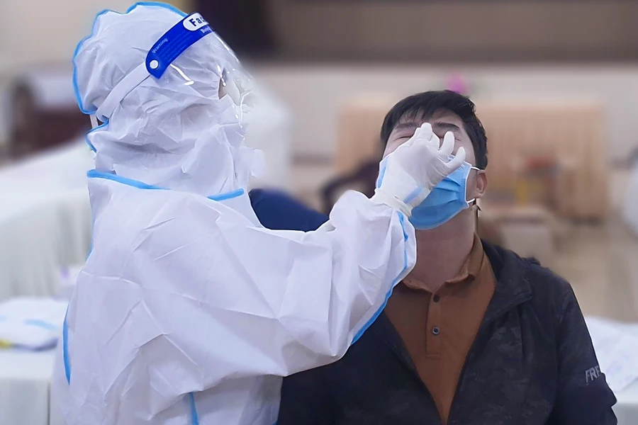 Lực lượng y tế lấy mẫu xét nghiệm COVID-19. Ảnh: N.D