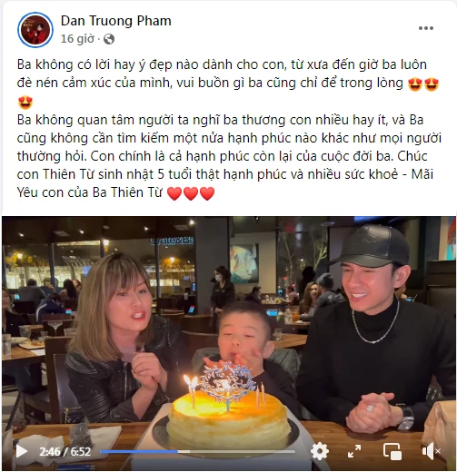 Giữa đêm 28-2, ca sĩ Đan Trường đã đăng tải đoạn video kèm theo dòng trạng thái mừng sinh nhật con trai Thiên Từ trên trang cá nhân. Đáng chú ý, trong đoạn video của ca sĩ Đan Trường còn có sự xuất hiện của Thuỳ Tiên - vợ cũ của nam ca sĩ.