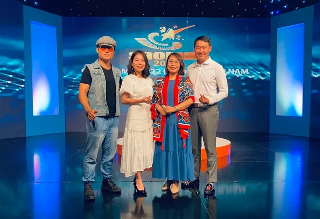 Ca sĩ Trung Nhật (áo trắng) cùng với các giám khảo chấm thi trong Vòng sơ loại Sao Mai 2022 khu vực miền Nam.