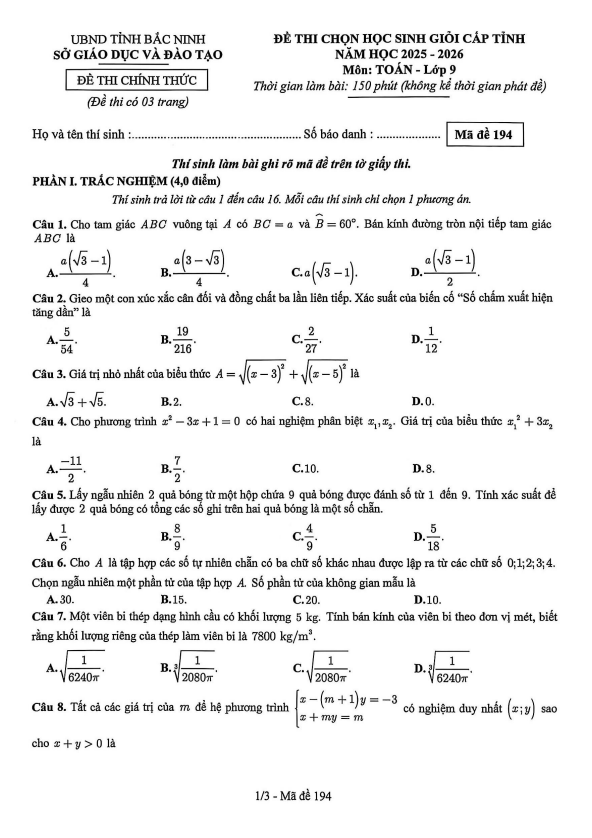 Đề chọn học sinh giỏi tỉnh Toán 9 năm 2025 – 2026 sở GD&ĐT Bắc Ninh 21/01/2026