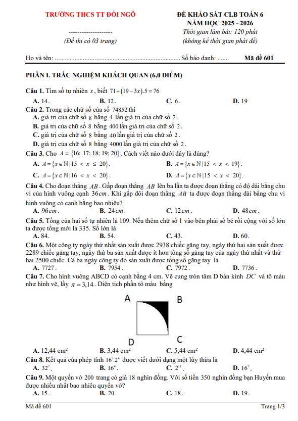 Đề khảo sát CLB Toán 6 năm 2025 – 2026 trường THCS TT Đồi Ngô – Bắc Ninh 21/01/2026