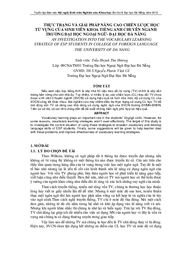 Nếu xem việc học tiếng Anh là xây nhà thì việc trau dồi từ vựng (TV) chính là xây nền móng bền vững cho căn nhà ấy. Tuy nhiên, vì nhiều lý do, các chiến lược (CL) trau dồi TV chưa được sinh viên Chuyên ngành (SVCN) sử dụng hiệu quả và hơn nữa mức độ sử dụng CL của SVCN cũng rất khác nhau. Bài nghiên cứu này nhằm điều tra thực trạng sử dụng CL học TV để mở rộng vốn TV và nâng cao khả năng sử dụng ngôn ngữ của SVCN trường ĐHNN-ĐHĐN. Trên cơ sở đó, có cái nhìn đúng đắn để đề xuất những kiến nghị phù hợp và hiệu quả.