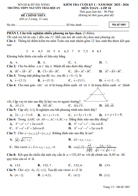 Đề cuối kỳ 1 Toán 10 năm 2025 – 2026 trường THPT Nguyễn Trãi – Đà Nẵng 19/01/2026