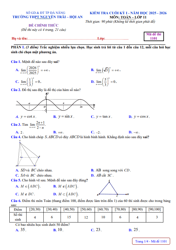 Đề cuối kỳ 1 Toán 11 năm 2025 – 2026 trường THPT Nguyễn Trãi – Đà Nẵng 19/01/2026