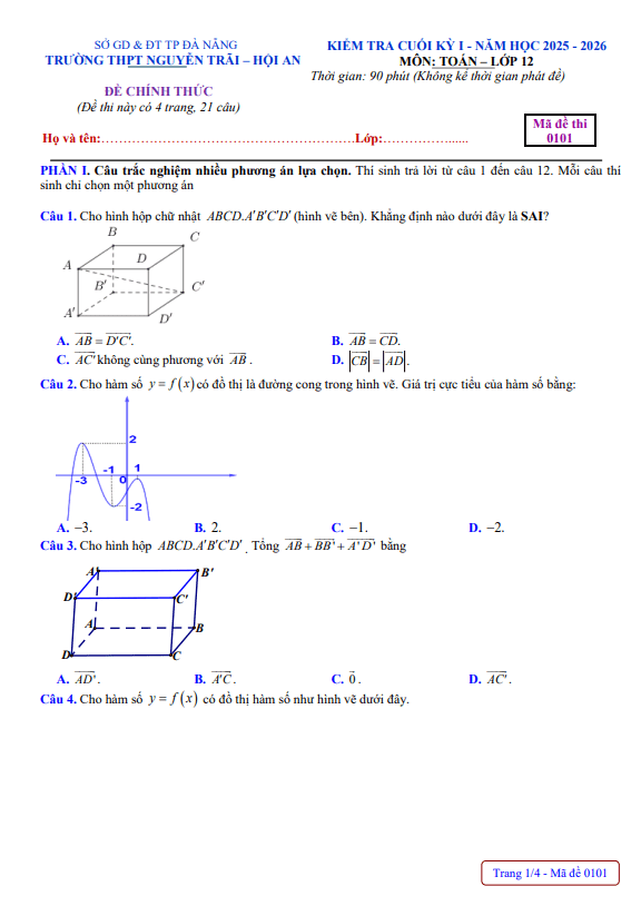 Đề cuối kỳ 1 Toán 12 năm 2025 – 2026 trường THPT Nguyễn Trãi – Đà Nẵng 19/01/2026