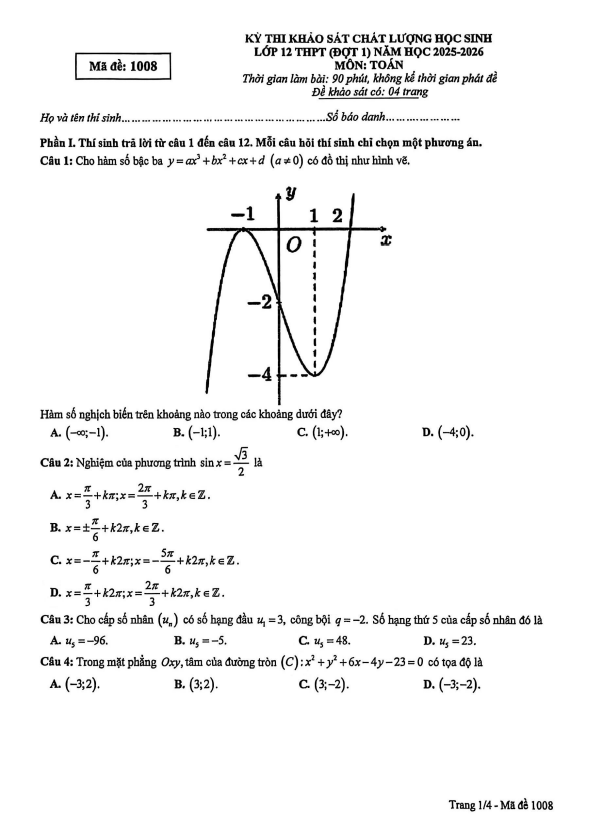 Đề khảo sát chất lượng Toán 12 đợt 1 năm 2025 – 2026 sở GD&ĐT Phú Thọ 19/01/2026