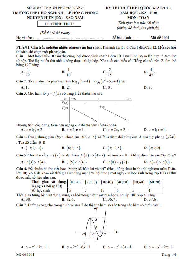 Đề thi thử THPT Quốc gia 2026 môn Toán lần 1 cụm 4 trường THPT – Đà Nẵng 18/01/2026