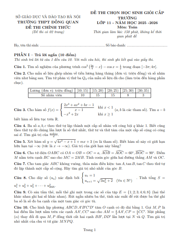 Đề chọn học sinh giỏi Toán 11 năm 2025 – 2026 trường THPT Đồng Quan – Hà Nội 03/03/2026