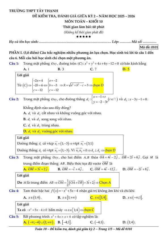 Đề giữa kỳ 2 Toán 10 năm 2025 – 2026 trường THPT Tây Thạnh – TP HCM 03/03/2026