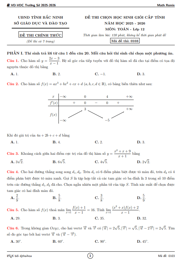 Đề chọn học sinh giỏi tỉnh Toán 12 năm 2025 – 2026 sở GD&ĐT Bắc Ninh 20/01/2026