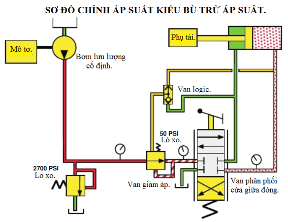 Chỉnh áp suất kiểu bù trừ theo mạch van dưới đây:Khi ta chỉnh áp suất cho bơm rồi nhưng khi vận hành với một phụ tải khác mà nhu cầu áp suất không cao bằng áp suất bơm,ta dùng thêm van giảm áp và van logic để chỉnh áp suất bù trừ như được chỉ dẫn trên sơ đồ mạch sau: