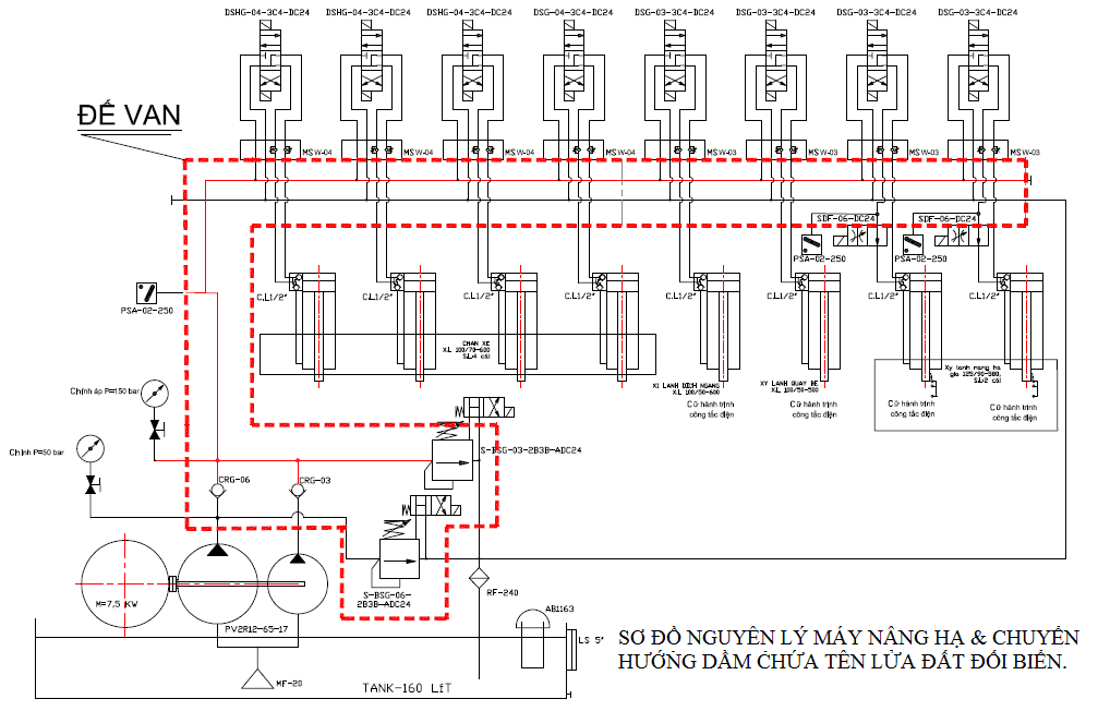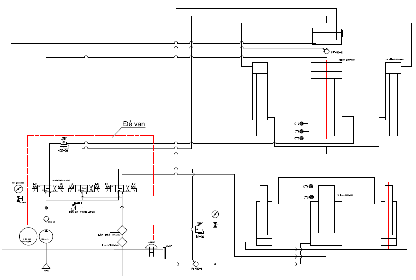 Sơ đồ hệ thủy lực cơ bản gồm: Bơm;động cơ điện,khớp nối;van an toàn,đồng hồ, khóa đồng:đế van và các van phân phối cùng với các van chức năng khác;thùng dầu và các phụ kiện trên thùng dầu.Hệ thống các thiết bị chấp hành như xi lanh hoăc mô tơ thủy lực.