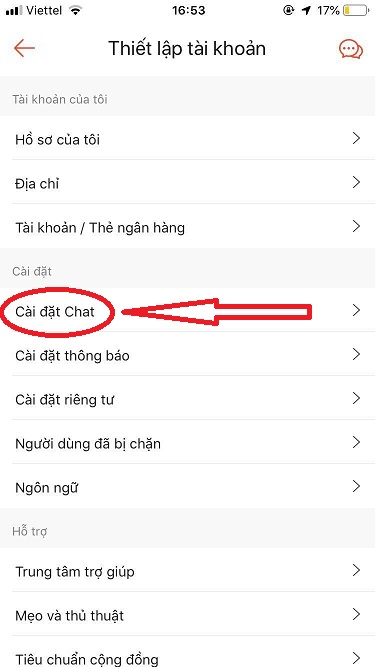 3/ Trong mục "Thiết lập tài khoản", nhấn vào mục "Cài đặt Chat"