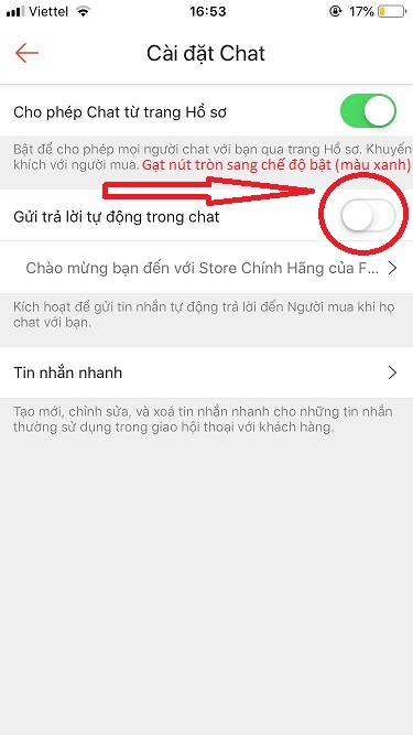 4/ Trong mục "Cài đặt Chat", Chọn mục "Gửi trả lời tự động trong chat" và gạt nút tròn sang phải chuyển màu xanh lá cây.