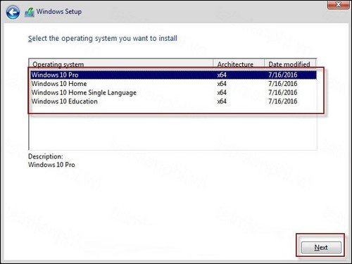 Ngay sau đó, chúng ta sẽ được lựa chọn cài đặt hệ điều hành Windows 10 mà mình muốn có trong danh sách cung cấp, rồi nhấn Next ở bên dưới.