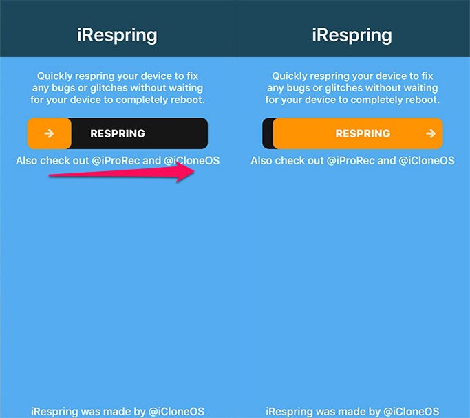 Quay về màn hình chính, mở tiện ích iRespring và tiến hành Respring lại máy (vuốt mũi tên sang bên phải giao diện) hoặc khởi động lại thiết bị theo cách thủ công là xong.