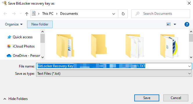 Tùy chọn “In khóa khôi phục” sẽ khởi chạy một cửa sổ mới, nơi bạn có thể in khóa khôi phục trên giấy. Nếu bạn chọn tùy chọn “Lưu vào tệp”, Windows sẽ mã hóa khóa khôi phục trong tệp văn bản. Lưu tệp vào thư mục / vị trí ưa thích của bạn trên PC và chọn Tiết kiệm.