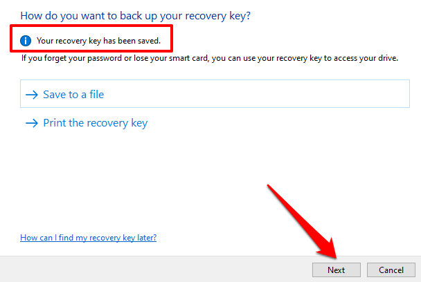 Windows sẽ tự động tạo khóa khôi phục cho ổ đĩa ngoài. Khóa khôi phục là một chìa khóa dự phòng để mở khóa ổ đĩa được mã hóa của bạn nếu bạn quên mật khẩu.