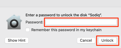 Khi quá trình mã hóa hoàn tất, hãy tháo và lắp lại ổ đĩa đã mã hóa hoặc cắm nó vào một máy Mac khác. Một cửa sổ nhập mật khẩu sẽ bật lên trên màn hình; nhập mật khẩu và chọn Mở khóa để có được quyền truy cập.