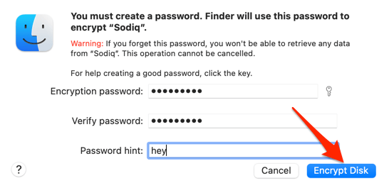 Công cụ mã hóa macOS sẽ bắt đầu mã hóa trên ổ đĩa. Thao tác này có thể mất vài giây hoặc vài phút, tùy thuộc vào nội dung và kích thước của ổ đĩa.