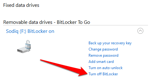 Tìm ổ đĩa ngoài trong phần “Ổ đĩa dữ liệu có thể tháo rời” và chọn Tắt BitLocker.