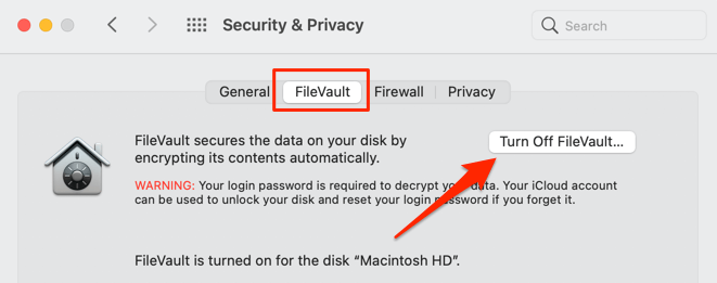 Không giống như Windows, bạn không thể truy cập ổ đĩa được mã hóa trên macOS bằng khóa khôi phục. Cách giải quyết duy nhất là tắt FileVault — công cụ mã hóa macOS. Hướng tới Tùy chọn hệ thống > Bảo mật & Quyền riêng tư > FileVault và chọn Tắt FileVault.