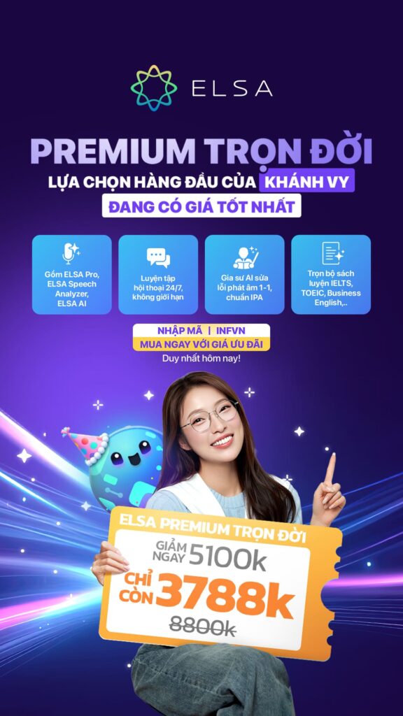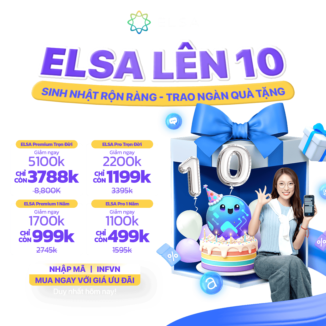 📢1 phút quảng cáo: Luyện tập tiếng Anh mỗi ngày cùng ELSA Premium! Với hơn 48.000 bài luyện tập cùng lộ trình học cá nhân hóa, ELSA Premium là người bạn đồng hành với bạn trên con đường chinh phục ngôn ngữ thông dụng nhất hành tinh. Click để khám phá ngay👇