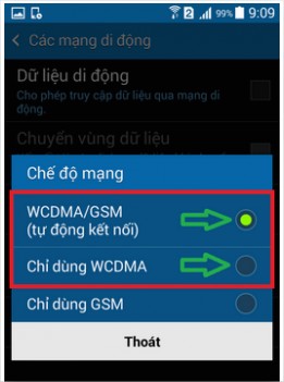 Khi vào đến mục các mạng di động, thì các bạn sẽ lựa chọn mục Chế độ mạng để đưa về chế độ WCDMA hoặc mạng WCDMA/GMS.