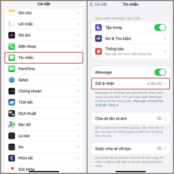- Bước 1: Vào Cài đặt > Chọn mục Tin nhắn > Chọn Gửi & Nhận.