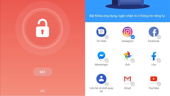 Để thêm các ứng dụng khác vào danh sách bảo vệ, bạn bấm vào biểu tượng dấu cộng ở góc phải bên dưới màn hình. Đối với những dòng điện thoại có hỗ trợ cảm biến vân tay, bạn có thể mở khóa ứng dụng bằng vân tay để tiết kiệm thời gian.